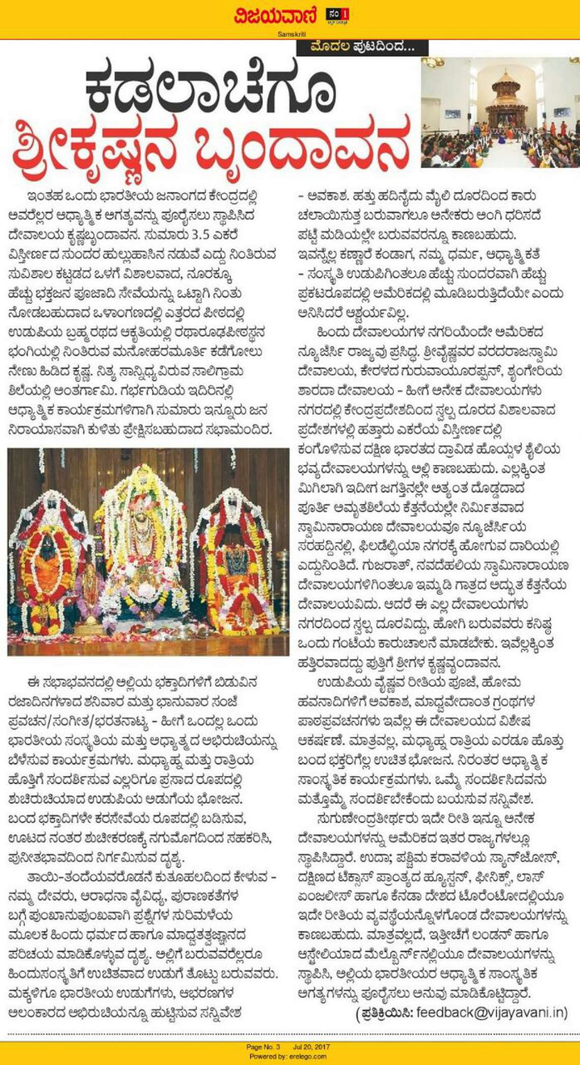 The article was published in Vijayavani dated 20th July, 2017 with the details regarding enshrinement ceremony at New Jersey and the public honor event to be held at Rajangana, Car Street, Udupi on 22nd July, 2017 at 4 PM.