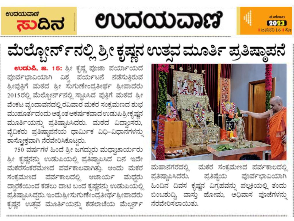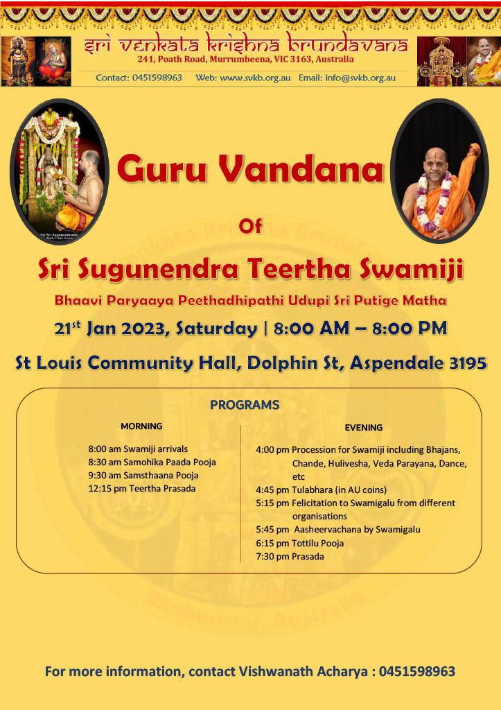 Bowing down in Reverence to Poojya Swamiji We the Melbourne devotees are indebted to Poojya Sugunendra teertha Swamiji for his courage and will to stand against all odds for the upliftment of all spiritual seekers through Krishna bhakti all around the globe. Ascending the Udupi Paryaya peetha one year from today on 18th Jan, Swamiji's Koti Gita Lekhana yagna is a proof of making us walk together to glorify Lord Almighty in one voice. We the devotees in all humility and praise will be offering heartfelt Guru Vandana and Tulabhaara Seva this Saturday the 21st at His Holiness's holy feet and seek blessings. May all glory be to our Swamiji.