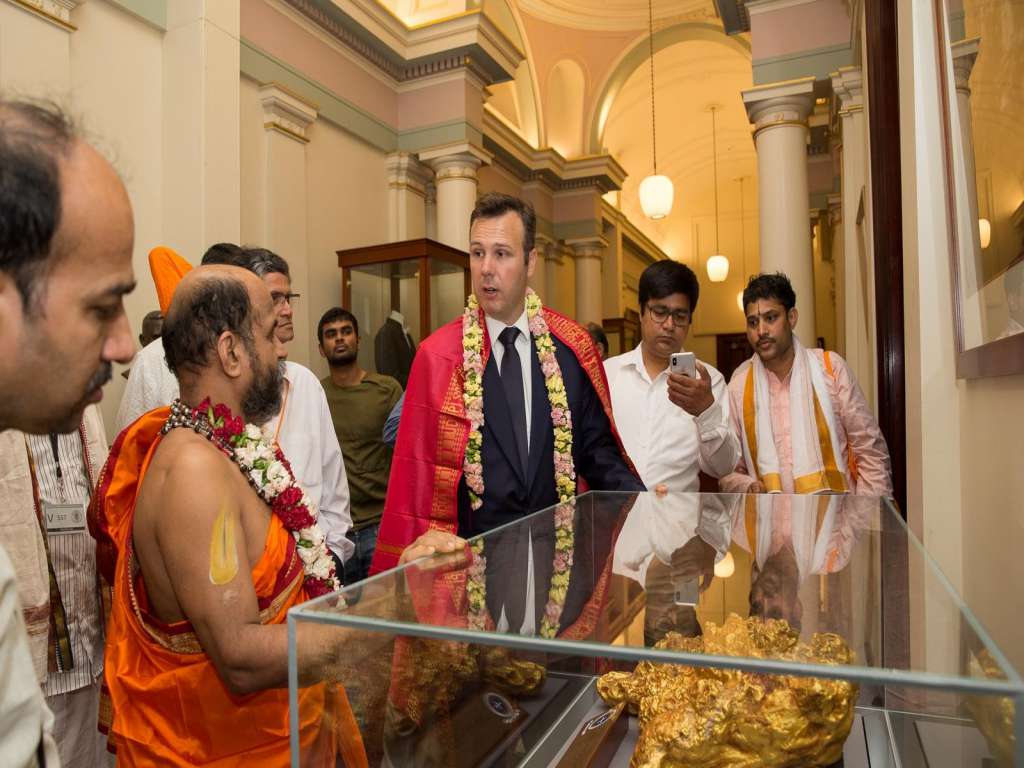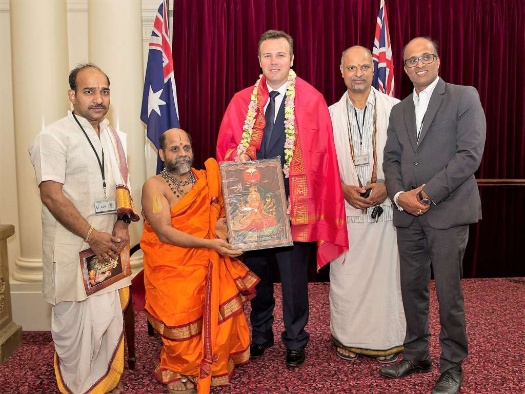 Shri Sugunendra Theertha Swamiji was given official welcome and felicitated at the Parliament of Victoria, Melbourne on 22nd January, 2018. Honorable Michael Gidley, Member of Parliament from Mount Waverley, received Swamiji and group of volunteers and provided a first hand tour of the Parliament House. He was felicitated by the Swamiji and was presented with the photo of Devi Jaganmathe. Honorable Michael Gidley spoke highly of the Swamiji and appreciated his efforts towards World Peace. He also expressed his desire to visit India in the near future to further soak into our culture. He was accorded an invitation to our Temple by the Swamiji.